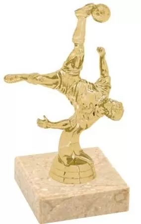 Športová figúrka s futbalovým motívom na mramorovom podstavci so štítkom.