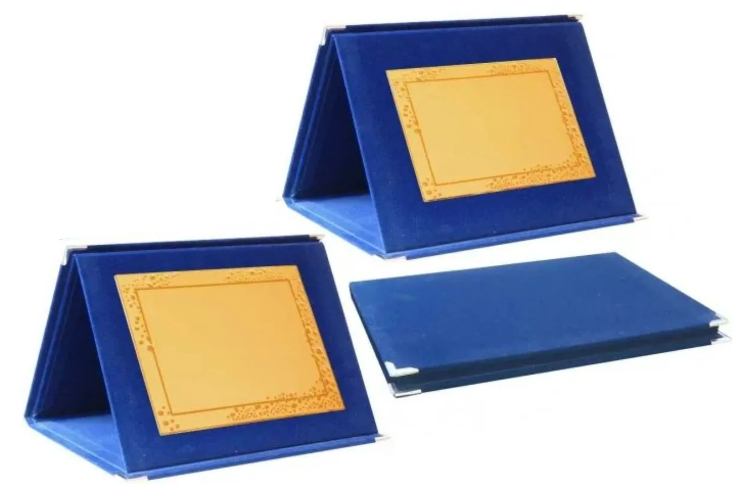 Športová plaketa v modrom puzdre zlatej farby s možnosťou laserového gravírovania alebo tlače.
