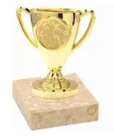 Športová figúrka v zlate, striebre a bronze na mramorovom podstavci so štítkom a emblémom 2,5 cm.