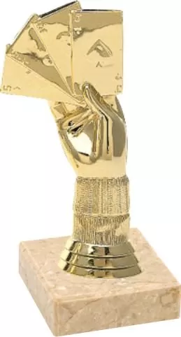 Sportovní figurka, karty v ruce ve zlatém provedení s možností štítku na mramorovém podstavci.