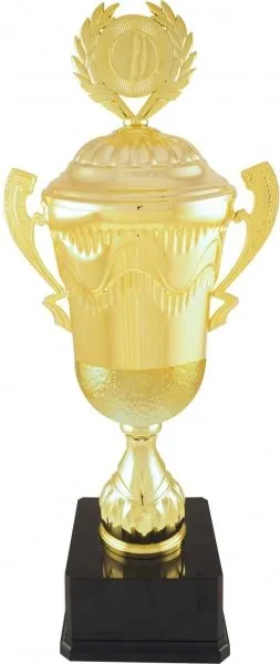 Športový luxusný pohár v zlatom vyhotovení vrátane veka s voliteľným 5 cm emblémom na veku a štítkom na čiernom plastovom podstavci.