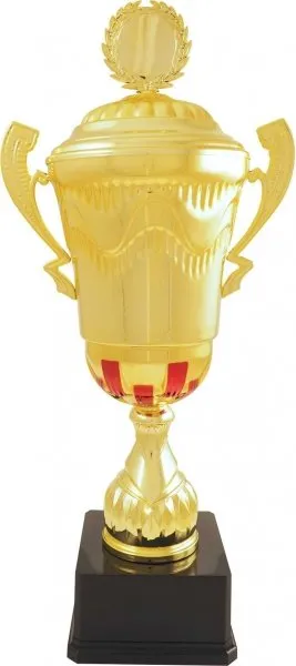 Športový luxusný pohár vrátane viečka s voliteľným 5cm emblémom vo viečku a štítkom na čiernom plastovom podstavci.