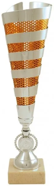 Športový luxusný pohár v strieborno-bronzovom vyhotovení s 2,5 cm emblémom a štítkom na mramorovom podstavci.