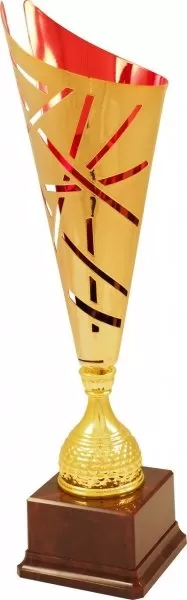 Luxusný pohár s možnosťou označenia na hnedom plastovom podklade v zlatej a červenej farbe.