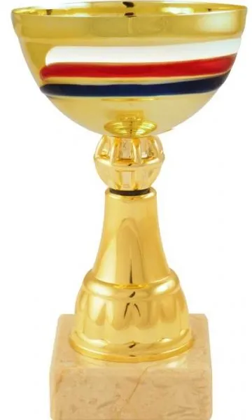 Športový pohár s českou trikolórou na mramorovom podstavci s etiketou.