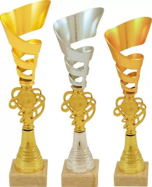 Športový pohár s 2,5cm emblémom a štítkom na mramorovom podstavci v zlatej, striebornej a bronzovej farbe.