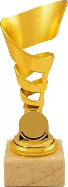 Športový pohár s 2,5 cm emblémom a štítkom na mramorovom podstavci v zlatom vyhotovení.