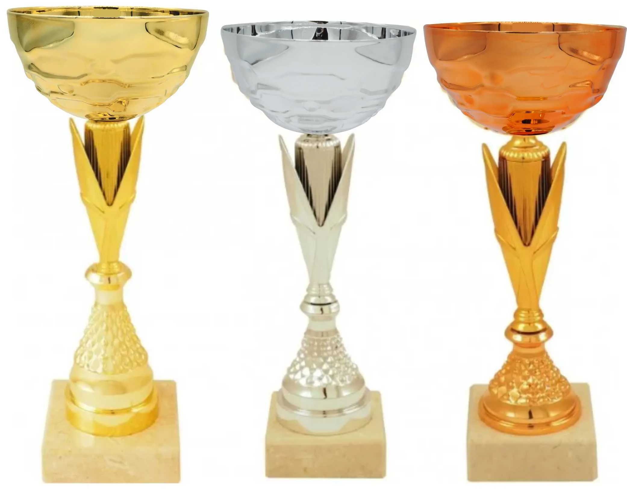 Športový pohár s vekom a štítkom na mramorovom podstavci v zlatej, striebornej a bronzovej farbe.