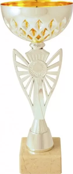 Športový pohár s originálnym vzhľadom kalicha s možnosťou 2,5 cm emblému, viečka a štítku na mramorovom podstavci v zlatom a striebornom prevedení.