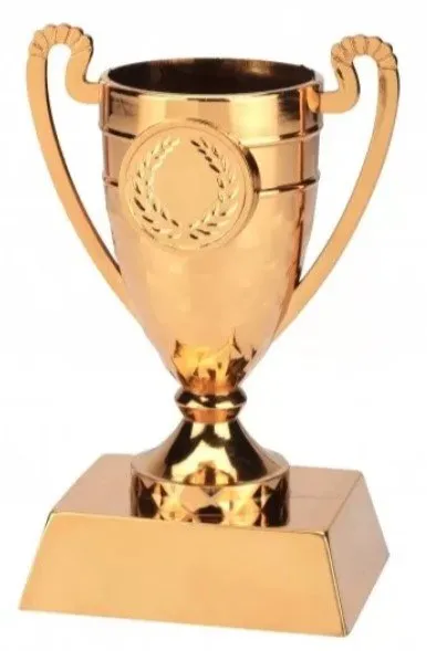 Športový pohár so štítkom a emblémom 2,5 cm v zlatej, striebornej a bronzovej farbe.