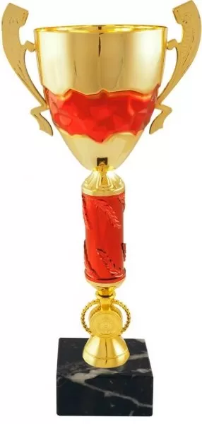Športový pohár s 2,5 cm emblémom, viečkom a štítkom na čiernom mramorovom podstavci.