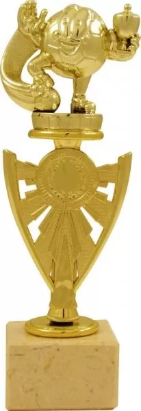 Športová veselá futbalová trofej s 2,5 cm emblémom a štítkom na mramorovom podstavci v zlatom prevedení.