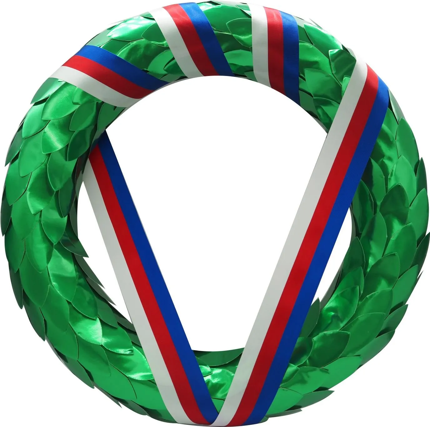 Športový vavrínový veniec z polystyrénu, priemer 50 cm. Stuha na veniec bez potlače - 45,- CZK. Stuha s potlačou 1-9 ks - paušál 950,- Sk + cena stuhy. Stuha s potlačou od 10 ks - 61,- Kč/ks. Príprava výroby 550,- Kč.
