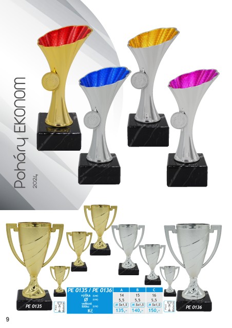 Poháry EKONOM 2024 PE 0135 / PE 0136 A B C výška (cm) 14 15 16 (cm) 5,5 5,5 5,5 PE 0135 Materiál velikost M 5x1,5 M 5x1,5 M 5x1,5 Materiál PE 0136 Plast Kč 135,- 140,- 150,- Plast štítku (cm) 9