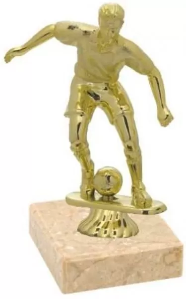 Športová futbalová figúrka so štítkom na mramorovom podstavci.