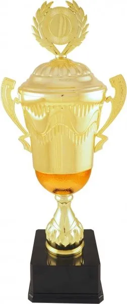 Športový luxusný pohár v zlatobronzovom vyhotovení vrátane viečka s voliteľným 5 cm emblémom vo viečku a štítkom na čiernom plastovom podstavci.
