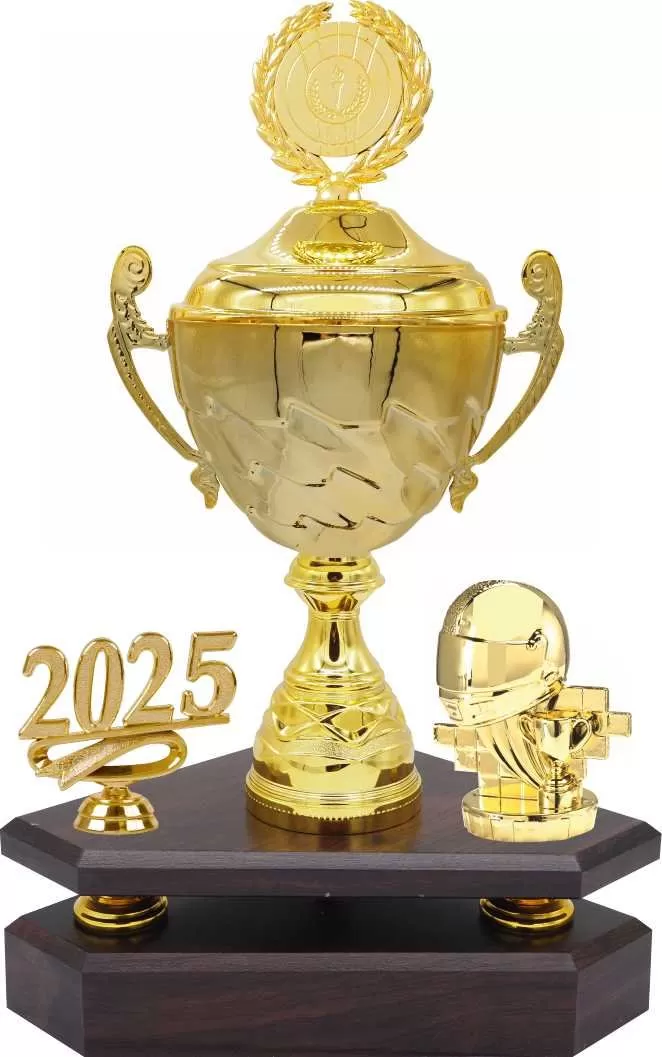 Športový luxusný pohár s možnosťou 5 cm emblému na veku a štítku na drevenom podstavci so zlatou povrchovou úpravou. Na pohár si vyberte ľubovoľnú športovú postavu a uveďte ju do poznámky.
