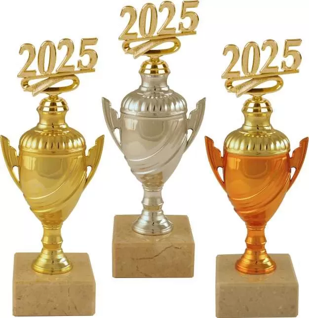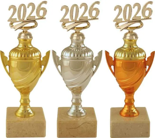 Športový pohár v zlatej, striebornej a bronzovej farbe vrátane vrchnáka s rokom 2024 a možnosťou štítku na mramorovom podstavci.
