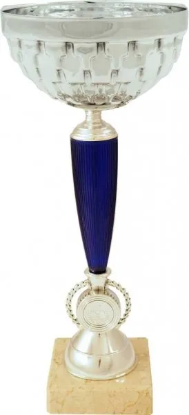Športový pohár s 2,5 cm emblémom, viečkom a štítkom na mramorovom podstavci v strieborno-modrom vyhotovení.