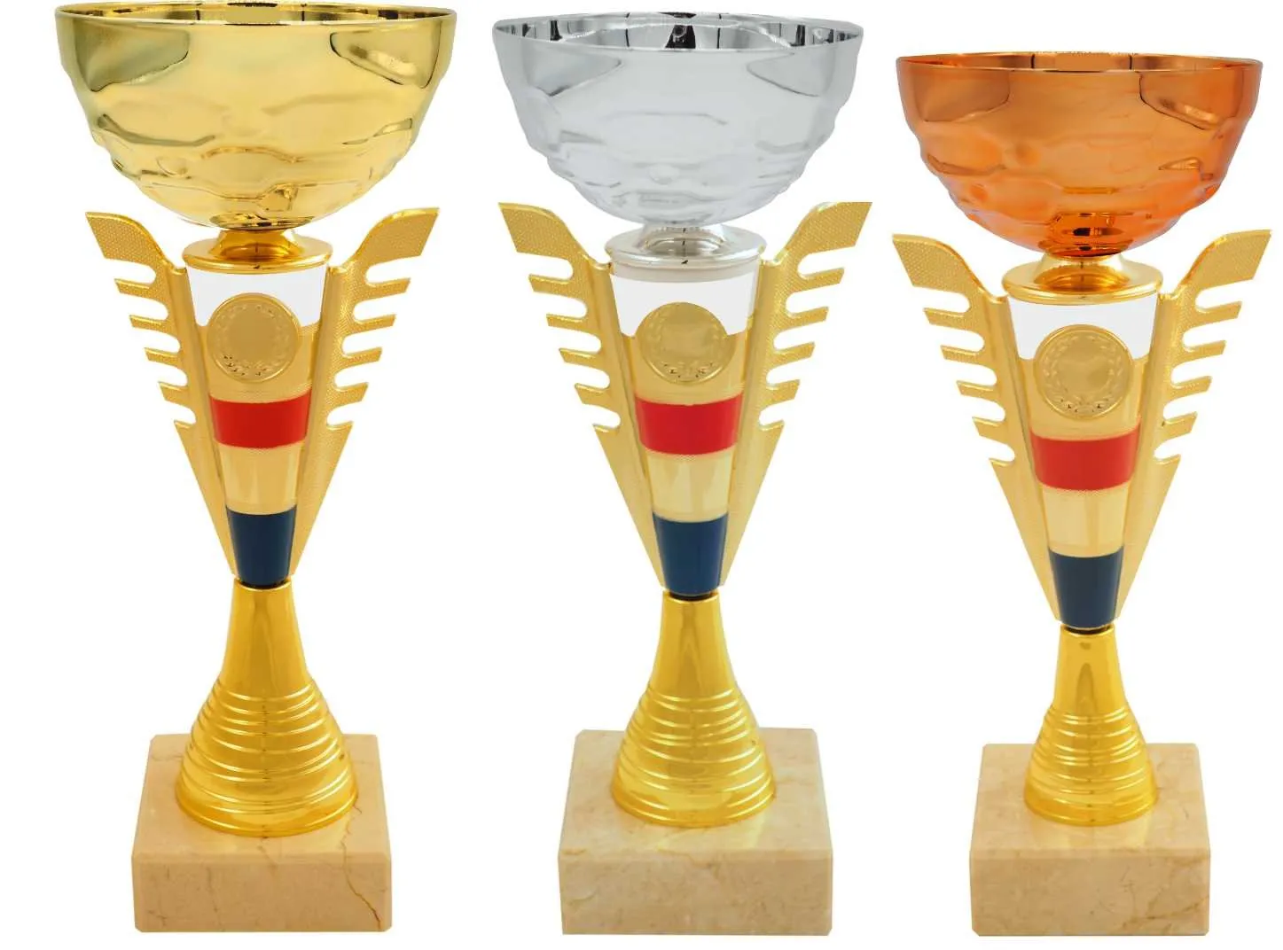 Športový pohár s voliteľným 2,5 cm emblémom, viečkom a štítkom na mramorovom podstavci. Pohár vo farbe českej trikolóry v zlatej, striebornej a bronzovej farbe.