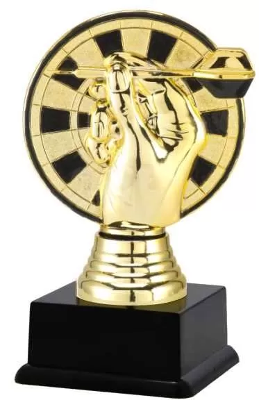 Športová trofej na čiernom plastovom podstavci so štítkom.