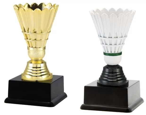 Športová figúrka bedmintonu na čiernom plastovom podstavci v zlatej alebo farebnej farbe s možnosťou štítku.